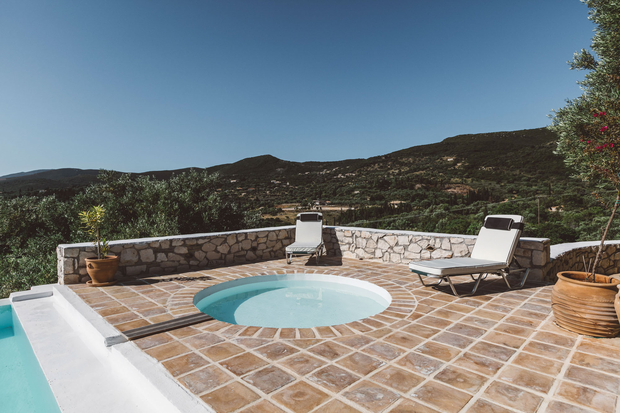 The property has been beautifully restored, featuring charming blue-painted windows and doors that reflect the authentic character of traditional Greece. The cottages share two swimming pools – a large rectangular pool perfect for swimming and a smaller shaded circular pool designed with toddlers in mind. It's an ideal spot for early risers to splash and play while the rest of the group relaxes, making it the perfect place for family groups.